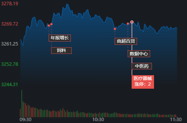 3月31日早盤,A股三大指數(shù)沖高震蕩,創(chuàng)業(yè)板指表現(xiàn)較強。截至上午11:30,上證指數(shù)漲0.22%,報3268.31點;深證成指和創(chuàng)業(yè)板指漲幅分別為0.27%和0.37%;滬深兩市成交額合計5486.2億元,較前一交易日縮減5.08%。總體來看,A股市場個股漲多跌少,漲跌停方面,有22只個股漲停,跌停股1只。