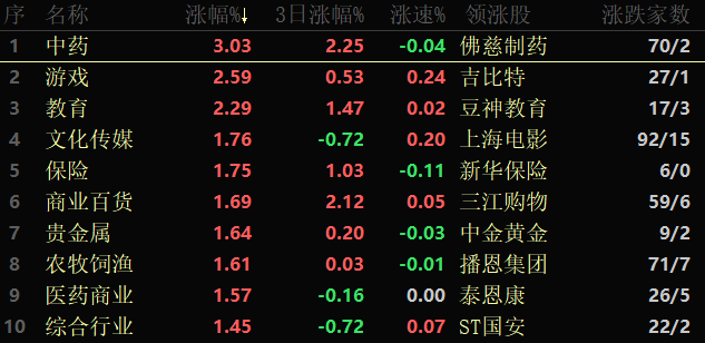 東方財富行業(yè)方面,截至3月31日11:30,86個行業(yè)板塊中68個上漲,占比79.07%,其中,中藥行業(yè)漲幅居前,達(dá)3.03%,此外,游戲和教育行業(yè)漲幅均超2%。下跌方面,船舶制造跌幅居首,達(dá)1.41%。