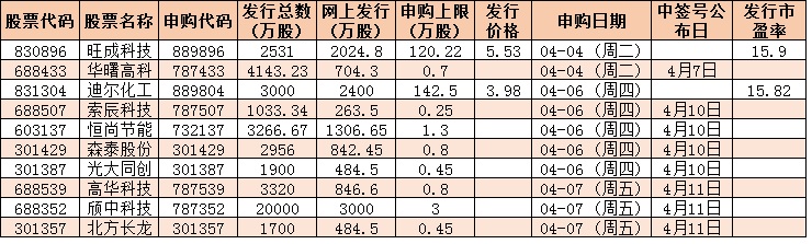 根據(jù)發(fā)行安排,下周共有10只新股發(fā)行,其中,4月4日發(fā)行的是華曙高科、旺成科技;4月6日發(fā)行的是光大同創(chuàng)、索辰科技、恒尚節(jié)能、森泰股份、迪爾化工;4月7日發(fā)行的是北方長龍、高華科技、頎中科技。