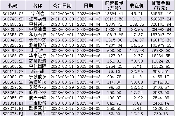 據(jù)同花順統(tǒng)計顯示,下周(4月3日-7日)共有20家公司限售股陸續(xù)解禁,按最新收盤價計算,解禁市值為230.74億元。從解禁市值來看,銘利達(dá)(60.56億元)、江蘇索普(56.67億元)、中科創(chuàng)達(dá)(32.61億元)等公司解禁金額均超30億元。