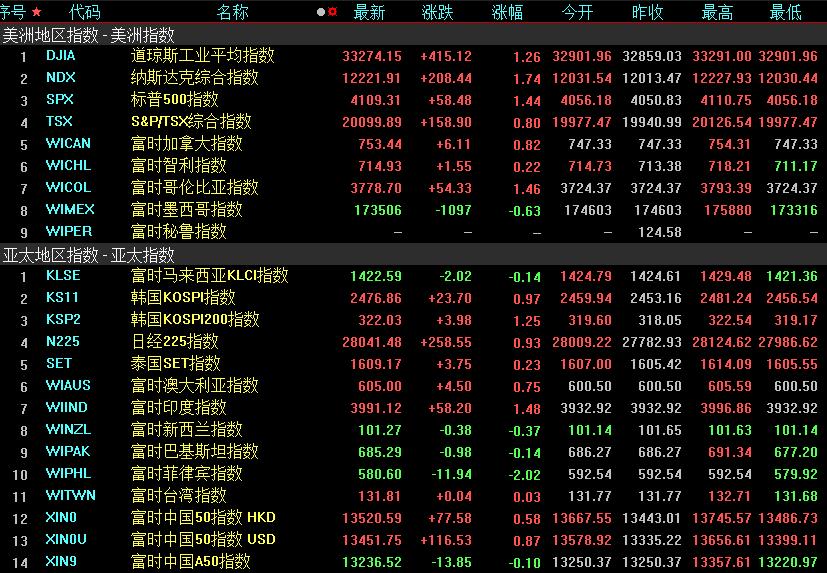 亞太主要股指收盤多數(shù)走高,韓國綜合指數(shù)漲0.97%報2476.86點,周漲2.56%;日經(jīng)225指數(shù)漲0.93%報28041.48點,周漲2.4%;澳洲標(biāo)普200指數(shù)漲0.78%報7177.8點,周漲3.22%;新西蘭NZX50指數(shù)跌0.41%報11884.5點,周漲2.62%。
