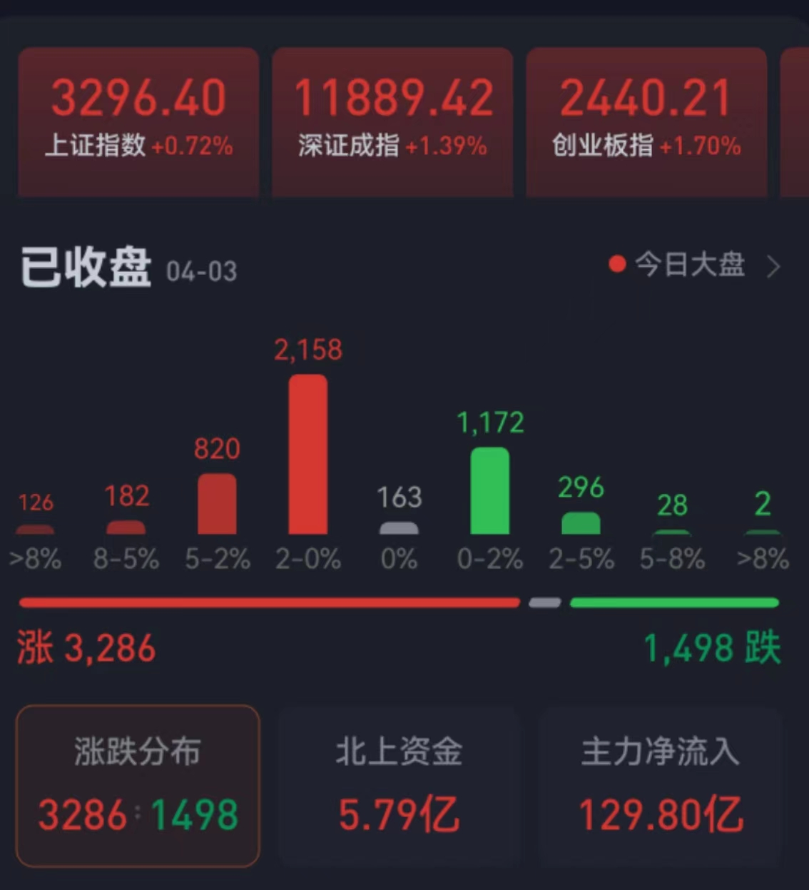 周一(4月3日),A股三大股指震蕩上行,全線飄紅。截至收盤,上證指數(shù)漲0.72%報3296.4點,深證成指漲1.39%報11889.42點,創(chuàng)業(yè)板指漲1.70%報2440.21點,科創(chuàng)50指數(shù)漲4.16%,兩市合計成交金額達12530億元,創(chuàng)9個月新高。北向資金凈買入5.79億元,連續(xù)5天凈買入??傮w上看,A股市場個股漲多跌少,超3000只個股實現(xiàn)上漲,其中,漲停個股達47只,跌停個股6只。