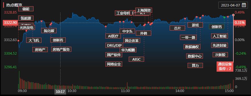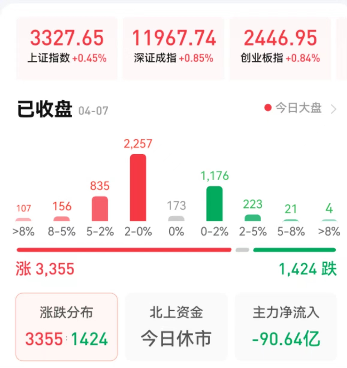 周五(4月7日),A股三大股指震蕩上行,全線飄紅。截至收盤,上證指數(shù)漲0.45%報3327.65點,實現(xiàn)六連陽;深證成指漲0.85%報11967.74點,創(chuàng)業(yè)板指漲0.84%報2446.95點,科創(chuàng)50指數(shù)漲1.23%;兩市合計成交金額達10540億元,連續(xù)第4個交易日突破萬億元;總體來看,A股個股漲多跌少。其中,漲停個股達49只,跌停個股達5只。