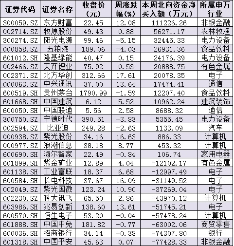 資金方面,本周北向資金累計凈流出30.72億元,其中滬股通資金凈流出17.87元,深股通資金凈流出12.85億元。從前十大成交活躍股來看,本周,東方財富、牧原股份等2只個股,北向資金凈買入金額均超5億元。另外,中國平安、招商銀行、中國中免等個股遭北向資金凈賣出金額均超6億元。