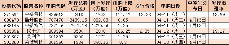 根據發(fā)行安排,下周(4月10日-14日)共有6只新股發(fā)行,其中科創(chuàng)板2只(晶升股份、中船特氣)、創(chuàng)業(yè)板2只(美利信、榮旗科技)、北交所2只(中??萍?、民士達)。