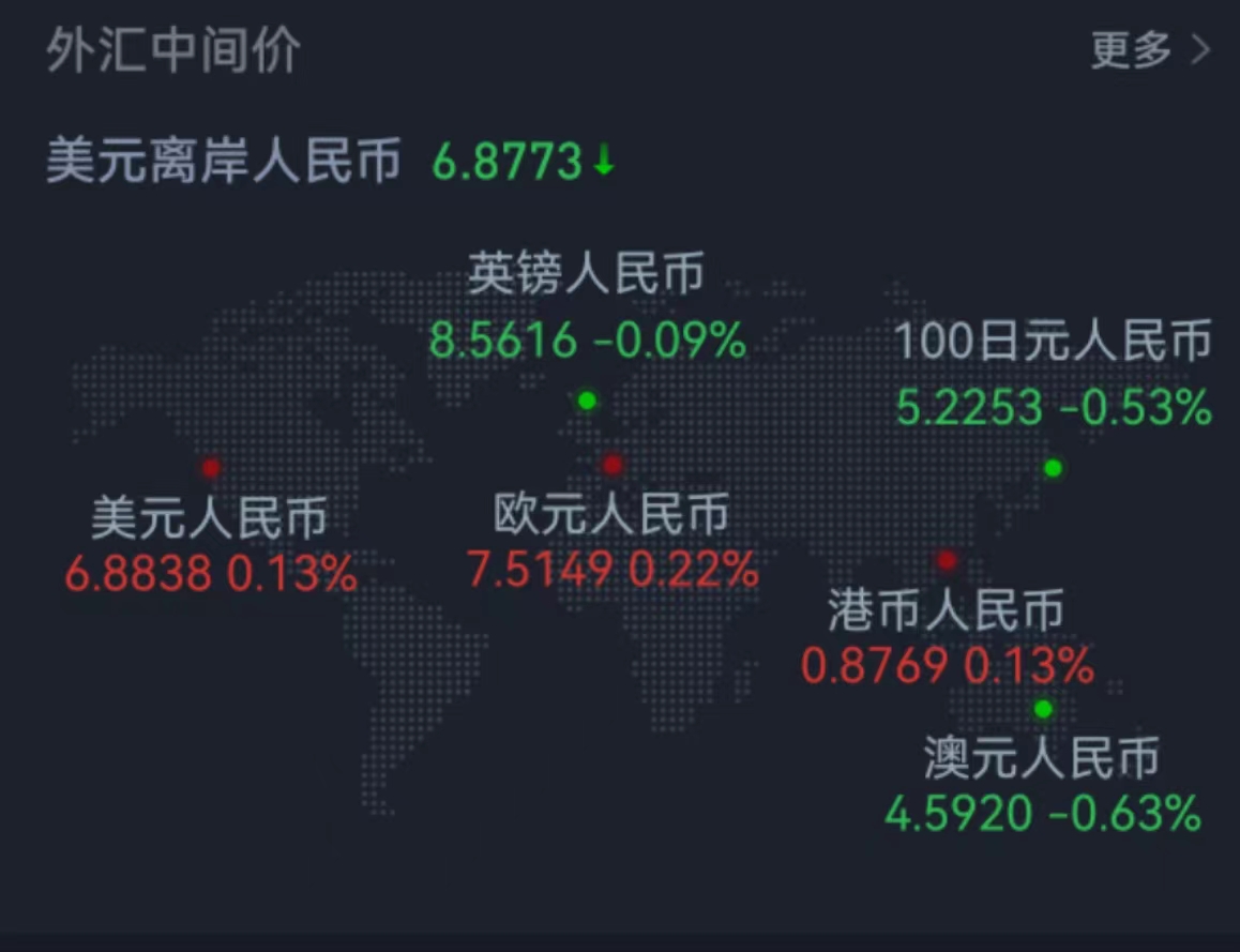 周五在岸人民幣兌美元16:30收盤報6.8754,較上一交易日漲53個基點,周跌41個基點。人民幣兌美元中間價報6.8838,調貶91個基點,本周累計調貶121個基點。在岸人民幣兌美元夜盤收報6.8650。交易員表示,多數歐美市場當日因假期休市,外匯市場交投清淡,人民幣總體窄幅波動。