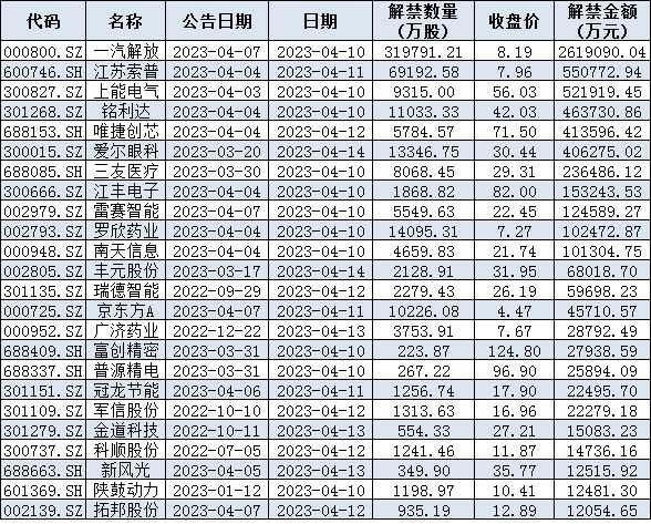 與此同時,統(tǒng)計顯示,下周(4月10日-14日)共有53家公司限售股陸續(xù)解禁,按最新收盤價計算,解禁市值為618.34億元。從解禁市值來看,一汽解放(261.91億元)、江蘇索普(55.08億元)、上能電氣(52.19億元)等公司解禁金額均超50億元。