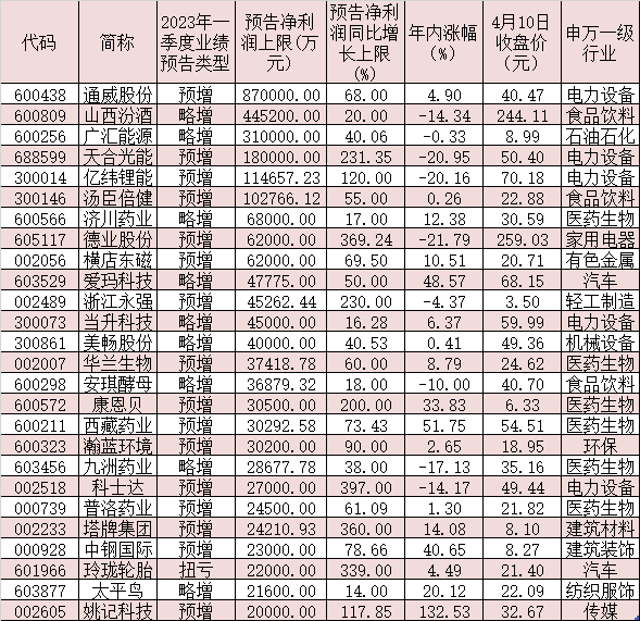 進(jìn)一步梳理發(fā)現(xiàn),上述92家業(yè)績預(yù)喜公司中,有40家公司預(yù)計(jì)今年一季度歸母凈利潤上限超1億元,通威股份、山西汾酒、廣匯能源、天合光能、億緯鋰能、湯臣倍健等6家公司預(yù)計(jì)今年一季度歸母凈利潤上限均超10億元。