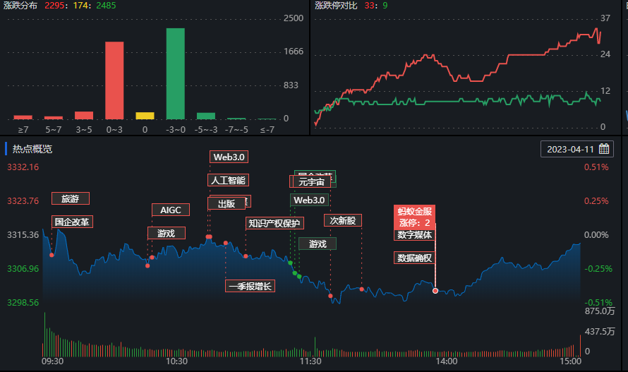 4月11日,A股三大指數(shù)尾盤拉升漲跌互現(xiàn),滬指3300點(diǎn)失而復(fù)得,A股成交金額連續(xù)6個(gè)交易日超萬(wàn)億元。傳媒板塊領(lǐng)漲,多只傳媒股漲停。