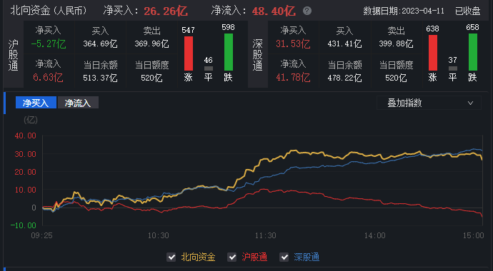 4月11日,截至收盤,上證指數(shù)跌0.05%報(bào)3313.57點(diǎn),深證成指漲0.04%報(bào)11877.15點(diǎn),創(chuàng)業(yè)板指跌0.17%報(bào)2439.40點(diǎn),A股合計(jì)成交額10834.59億元;北向資金全天凈買入26.26億元,其中滬股通凈賣出5.27億元,深股通凈買入31.53億元。今日A股中有2295只上漲,2485只下跌。