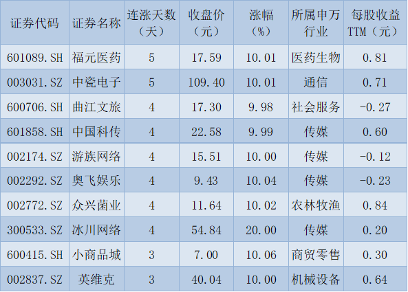 表:連續(xù)上漲3日且今日收盤漲停股一覽