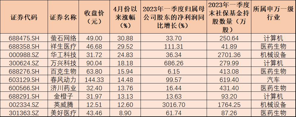 表:4月份以來社保基金重倉股漲幅居前十個股一覽