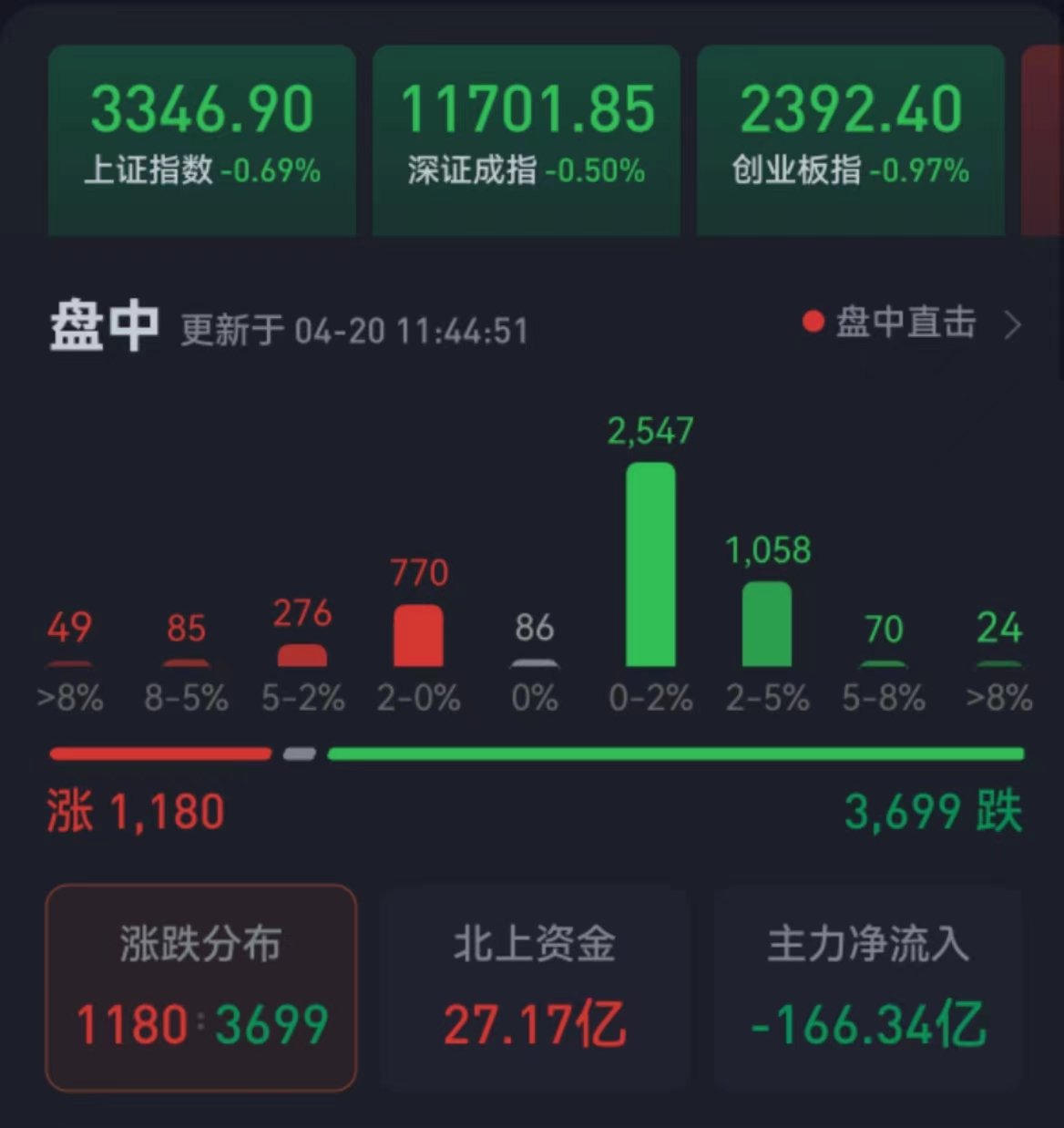 周四(4月20日),三大股指繼續(xù)震蕩整理,略有回落。截至上午收盤,上證指數(shù)跌幅達(dá)0.69%,報(bào)3346.90點(diǎn);深證成指和創(chuàng)業(yè)板指跌幅分別為0.50%和0.97%;值得關(guān)注的是,科創(chuàng)50逆市大漲2.08%,滬深兩市合計(jì)成交額6866.3億元,總體來看,兩市個(gè)股跌多漲少。