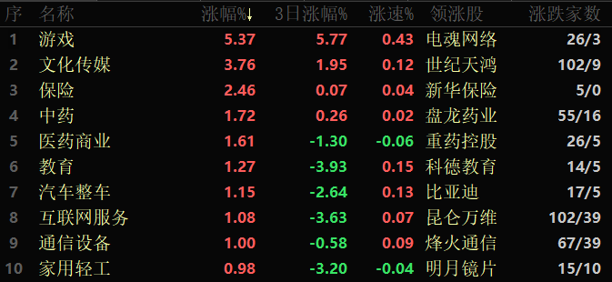 從早盤表現(xiàn)強勢的游戲行業(yè)看,交易中的29只成份股中26只上漲,其中,有13只個股漲幅超5%。資金方面,有19.6億元大單資金凈流入該行業(yè),居各行業(yè)第1位。