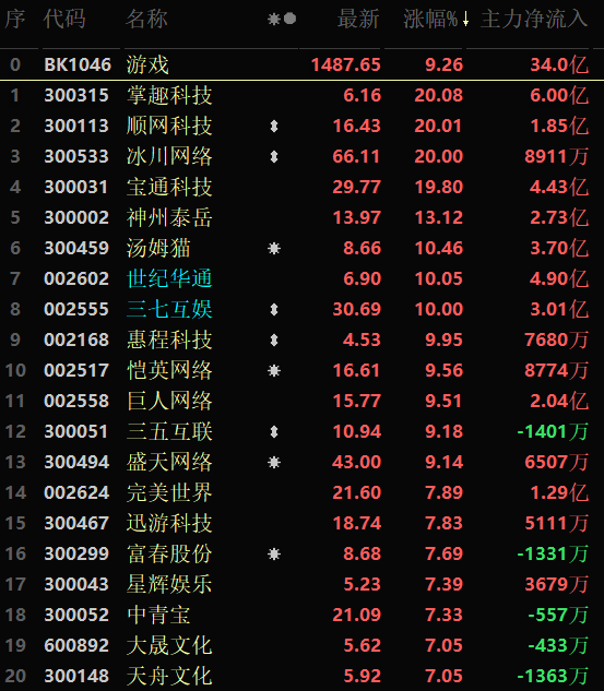 從早盤表現(xiàn)強(qiáng)勢(shì)的游戲行業(yè)看,交易中的29只成份股全線上漲,其中,有24只個(gè)股漲幅超5%。資金方面,有34億元大單資金凈流入該行業(yè),居各行業(yè)第1位。