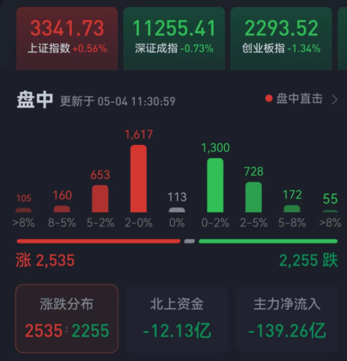周四(5月4日),三大股指震蕩分化,漲跌不一。截至上午收盤,上證指數(shù)漲幅達0.56%,報3341.73點;深證成指和創(chuàng)業(yè)板指跌幅分別為0.73%和1.34%;滬深兩市合計成交額7732.0億元,總體來看,兩市個股漲多跌少。