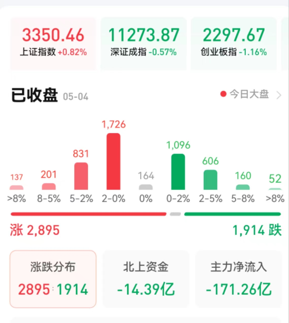 周四(5月4日),A股三大股指震蕩分化,漲跌不一。截至收盤(pán),上證指數(shù)漲0.82%報(bào)3350.46點(diǎn),深證成指跌0.57%報(bào)11273.87點(diǎn),創(chuàng)業(yè)板指跌1.16%報(bào)2297.67點(diǎn);兩市合計(jì)成交額達(dá)11717億元,連續(xù)第20個(gè)交易日突破萬(wàn)億元;北向資金凈賣(mài)出14.39億元??傮w上看,兩市個(gè)股漲多跌少。其中,漲停個(gè)股達(dá)102只,跌停個(gè)股達(dá)30只。