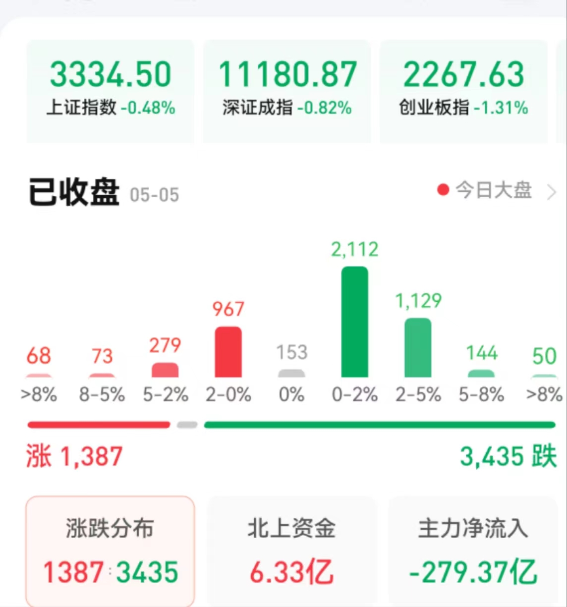 周五(5月5日),A股三大股指震蕩回落,全線下跌。截至收盤,上證指數(shù)跌0.48%報3334.5點,深成指跌0.82%報11180.87點,創(chuàng)業(yè)板指跌1.31%報2267.63點,科創(chuàng)50指數(shù)跌1.42%;兩市合計成交10712億元,連續(xù)第21個交易日突破萬億元,北向資金凈買入6.33億元??傮w上看,兩市個股跌多漲少。其中,漲停個股達50只,跌停個股達50只。