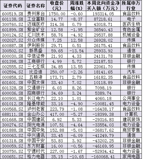 資金方面,本周北向資金累計(jì)凈賣出金額達(dá)8.06億元。從前十大成交活躍股來看,本周,貴州茅臺(tái)、工業(yè)富聯(lián)等2只個(gè)股,北向資金凈買入金額均超8億元。另外,格力電器、寧德時(shí)代等個(gè)股遭北向資金凈賣出金額均超5億元。