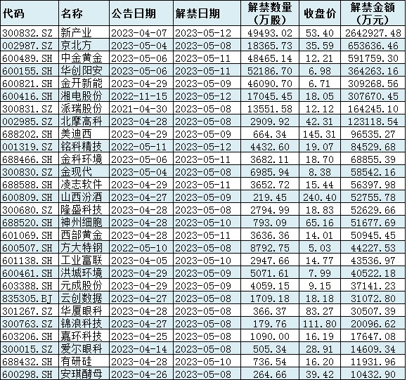 與此同時(shí),統(tǒng)計(jì)顯示,下周(5月8日-12日)共有75家公司限售股陸續(xù)解禁,按最新收盤價(jià)計(jì)算,解禁市值為616.57億元。從解禁市值來看,新產(chǎn)業(yè)(264.29億元)、京北方(65.36億元)、中金黃金(59.18億元)等公司解禁金額均超50億元。