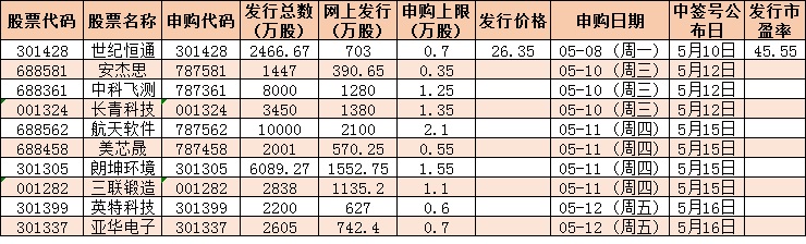 根據(jù)發(fā)行安排,下周(5月8日-12日)有10只新股發(fā)行。具體來看,周一1只,世紀(jì)恒通;周三3只,安杰思、中科飛測(cè)、長(zhǎng)青科技;周四4只,航天軟件、美芯晟、朗坤環(huán)境、三聯(lián)鍛造;周五2只,英特科技、亞華電子。