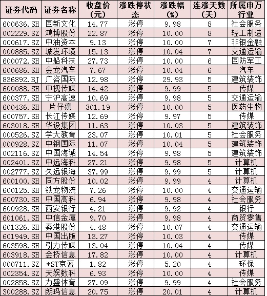 表:連續(xù)上漲4日且今日收盤漲停個股情況: