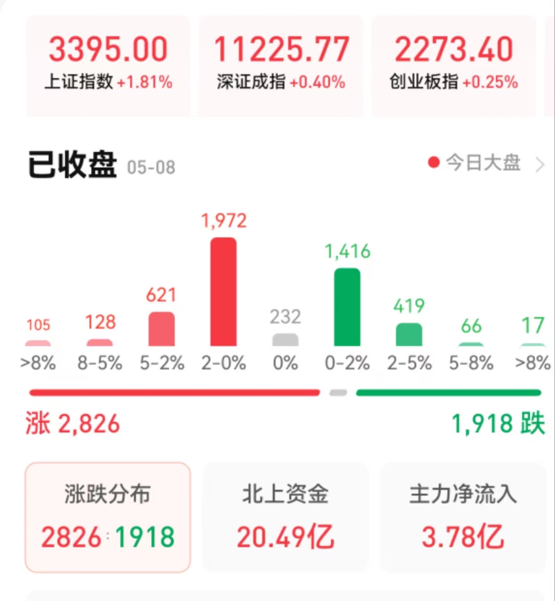周一(5月8日),A股三大股指震蕩上行,全線飄紅。截至收盤,上證指數(shù)漲1.81%報3395點,深證成指漲0.4%報11225.77點,創(chuàng)業(yè)板指漲0.25%報2273.4點;兩市合計成交金額11369億元,連續(xù)第22個交易日突破萬億元。北向資金凈買入20.49億元??傮w上看,兩市個股漲多跌少。其中,漲停個股達62只,跌停個股達51只。