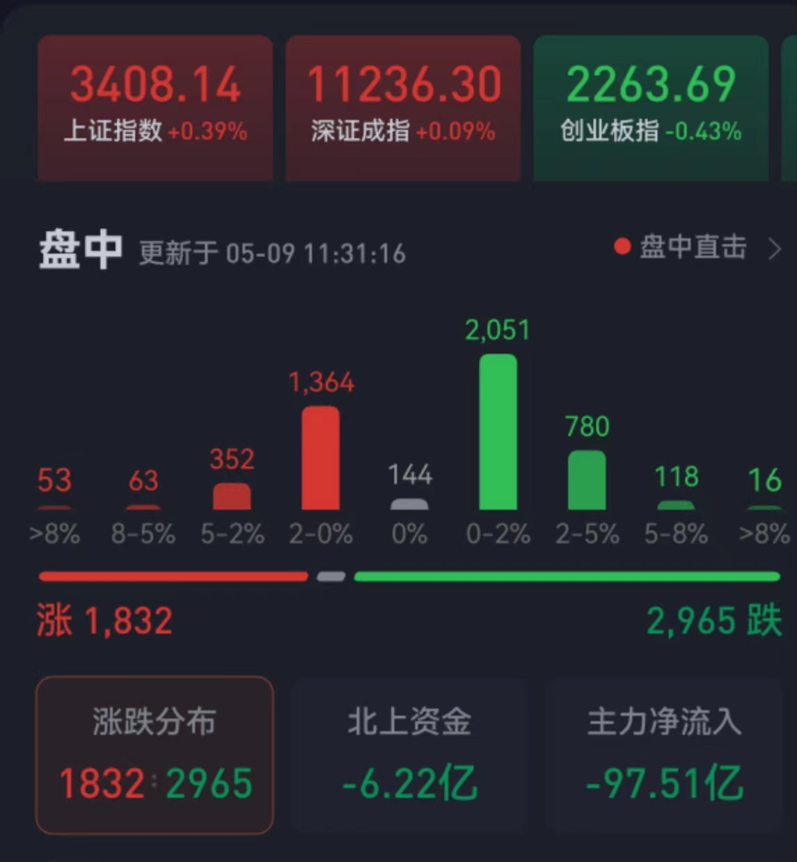 周二(5月9日),三大股指震蕩分化,漲跌不一。截至上午收盤,上證指數(shù)漲0.39%,報(bào)3408.14點(diǎn),成功站上3400點(diǎn);深證成指微漲0.09%,創(chuàng)業(yè)板指跌0.43%;滬深兩市合計(jì)成交額7599.9億元,總體來看,兩市個股跌多漲少。