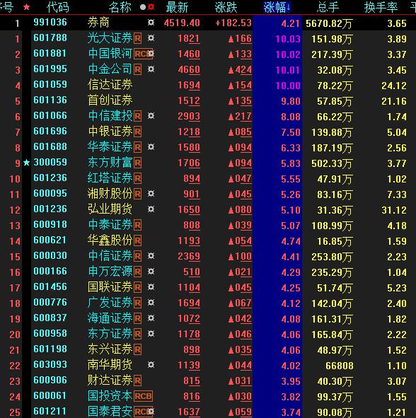 具體看,截至5月9日上午收盤,券商板塊漲幅居首達(dá)4.21%。其中,光大證券、中國銀河、中金公司、信達(dá)證券等多只券商股集體漲停。