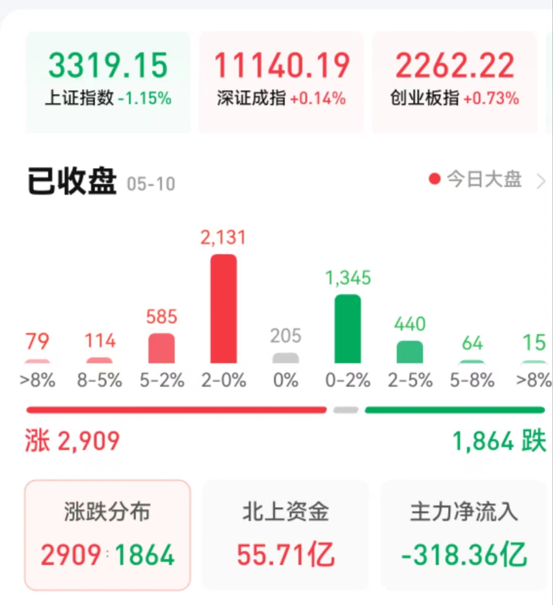 周三(5月10日),A股三大股指震蕩分化,漲跌不一。截至收盤,上證指數(shù)跌1.15%報3319.15點,深證成指漲0.14%報11140.19點,創(chuàng)業(yè)板指漲0.73%報2262.22點;兩市合計成交金額達10201億元,連續(xù)第24個交易日突破萬億元,北向資金凈買入55.71億元??傮w上看,兩市個股漲多跌少。其中,漲停個股達40只,跌停個股達49只。