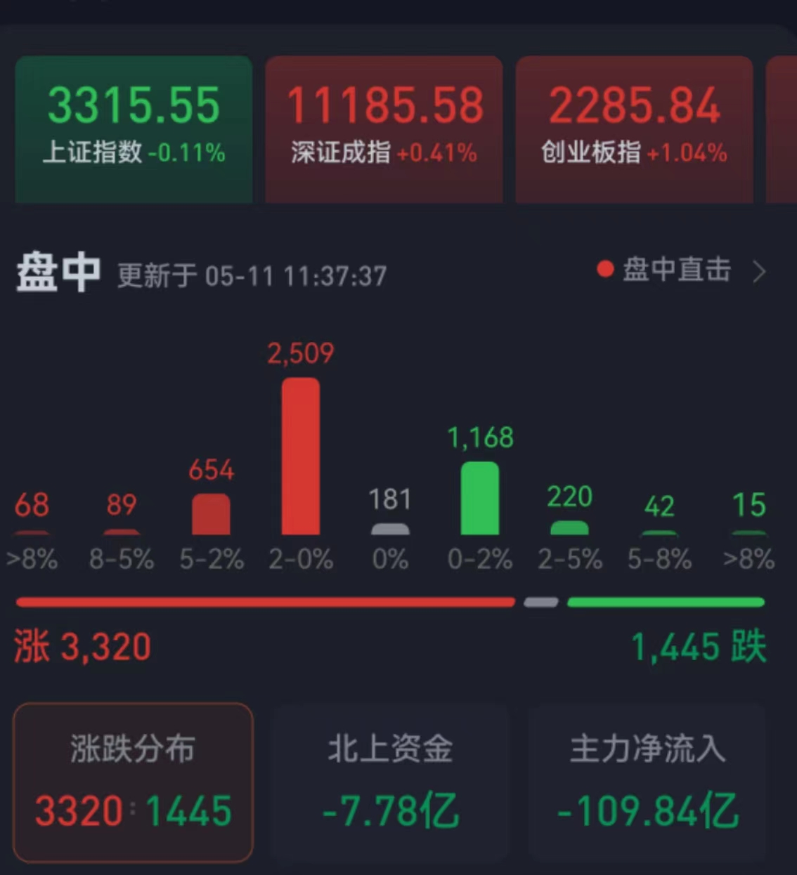周四(5月11日),三大股指震蕩分化,漲跌不一。截至上午收盤,上證指數(shù)跌0.11%,報(bào)3315.55點(diǎn);深證成指漲0.41%,創(chuàng)業(yè)板指漲幅為1.04%;滬深兩市合計(jì)成交額5829.2億元,總體來(lái)看,兩市個(gè)股漲多跌少。