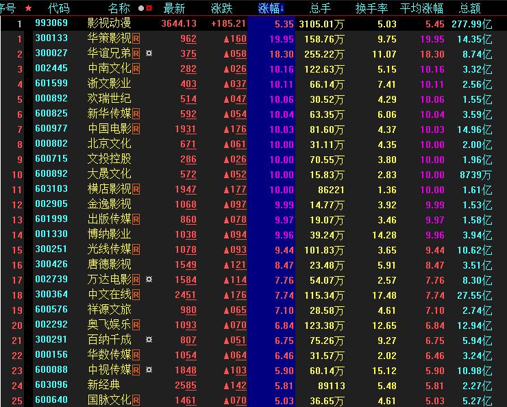 具體看,截至5月11日上午收盤,影視動(dòng)漫板塊漲幅居首達(dá)5.35%,掀起漲停潮。其中,包括華策影視、中南文化、新華傳媒、歡瑞世紀(jì)、中國(guó)電影、出版?zhèn)髅健M店影視等在內(nèi)的超10只概念股集體漲停。