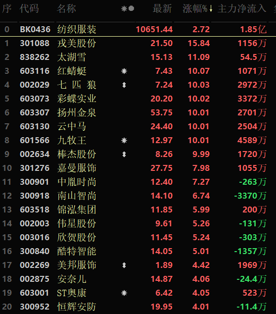 從早盤表現(xiàn)強(qiáng)勢(shì)的紡織服務(wù)行業(yè)看,交易中的103只成份股中有93只上漲,其中,有16只個(gè)股漲幅超5%。資金方面,有1.85億元大單資金凈流入該行業(yè),居各行業(yè)第3位。