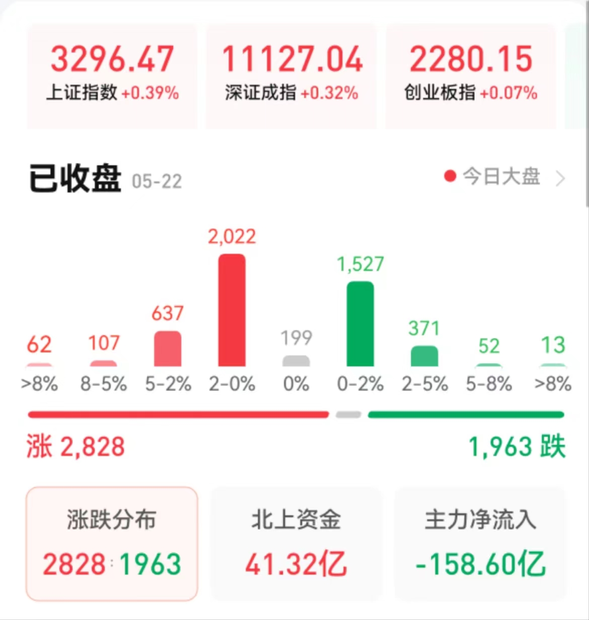 周一(5月22日),A股三大股指震蕩上行,全線飄紅。截至收盤,上證指數(shù)漲0.39%報(bào)3296.47點(diǎn),深證成指漲0.32%報(bào)11127.04點(diǎn),創(chuàng)業(yè)板指微漲0.07%報(bào)2280.15點(diǎn);兩市合計(jì)成交金額7954億元。今日,北向資金合計(jì)凈買入金額41.32億元,此前連續(xù)2日凈賣出。其中,滬股通凈買入34.69億元,深股通凈買入6.63億元??傮w上看,兩市個(gè)股漲多跌少。其中,漲停個(gè)股達(dá)52只,跌停個(gè)股達(dá)23只。