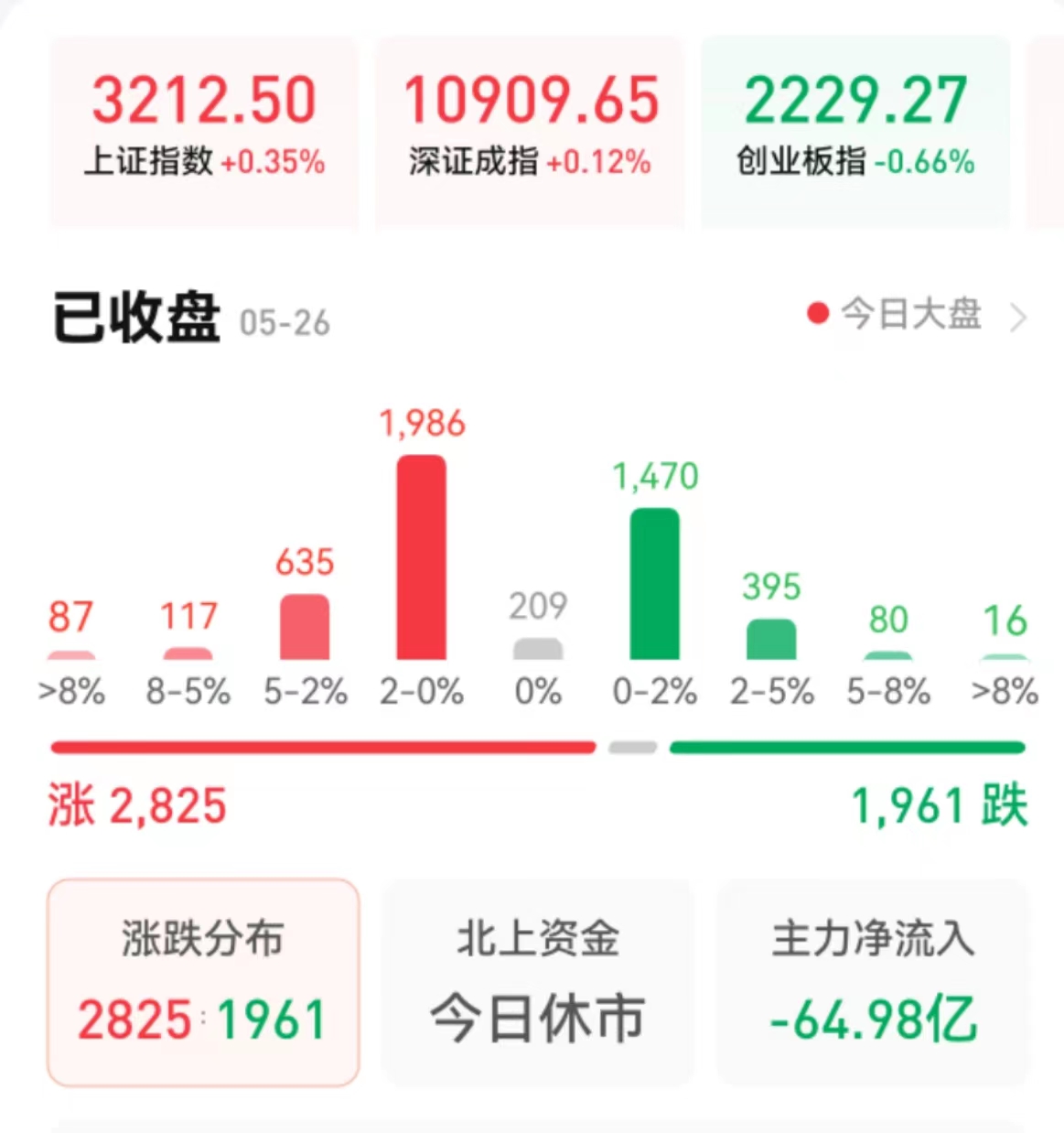 周五(5月26日),A股三大股指震蕩分化,漲跌不一。截至收盤,上證指數(shù)漲0.35%報(bào)3212.50點(diǎn),深證成指漲0.12%報(bào)10909.65點(diǎn),創(chuàng)業(yè)板指微跌0.66%報(bào)2229.27點(diǎn);兩市合計(jì)成交8205億元??傮w上看,兩市個(gè)股漲多跌少。其中,漲停個(gè)股達(dá)52只,跌停個(gè)股達(dá)25只。