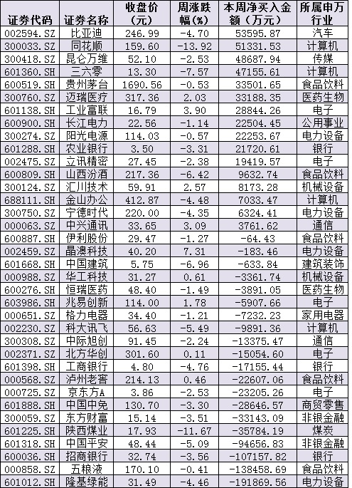 資金方面,本周北向資金累計(jì)凈賣出金額達(dá)178.88億元,其中滬股通凈賣出58.88億元,深股通凈賣出120億元。從前十大成交活躍股來看,本周,比亞迪、同花順等2只個(gè)股,北向資金凈買入金額均超5億元。另外,隆基綠能、五糧液、招商銀行等個(gè)股遭北向資金凈賣出金額均超10億元。