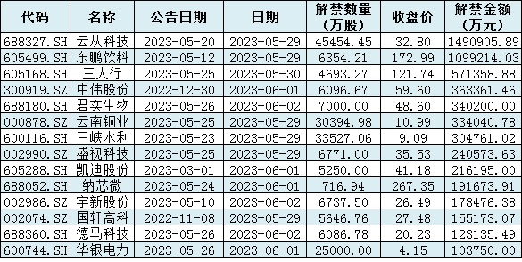 與此同時(shí),統(tǒng)計(jì)顯示,下周(5月29日-6月2日)共有75家公司限售股陸續(xù)解禁,按最新收盤價(jià)計(jì)算,解禁市值為627.95億元。從解禁市值來看,云從科技-UW(149.09億元)、東鵬飲料(109.92億元)等公司解禁金額均超100億元。