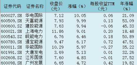 表:今日火力發(fā)電板塊漲幅前十個(gè)股一覽