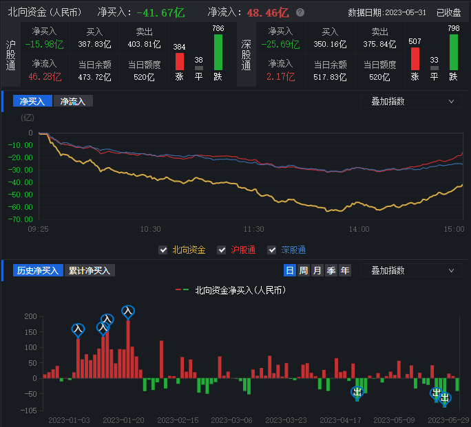 5月31日,三大指數(shù)低開后震蕩回落。行業(yè)板塊和個股漲少跌多,北向資金凈賣出逾41億元。業(yè)內(nèi)樂觀人士表示,短期股市的走弱不太能說明長期的問題,長期中國股市的投資價值是毋庸置疑的。