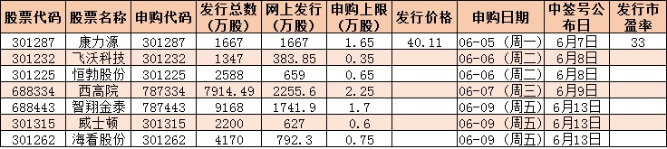 根據(jù)發(fā)行安排,下周將有7只新股申購,周一可申購康力源,周二可申購恒勃股份、飛沃科技、周三可申購西高院,周五可申購海看股份、威士頓、智翔金泰。