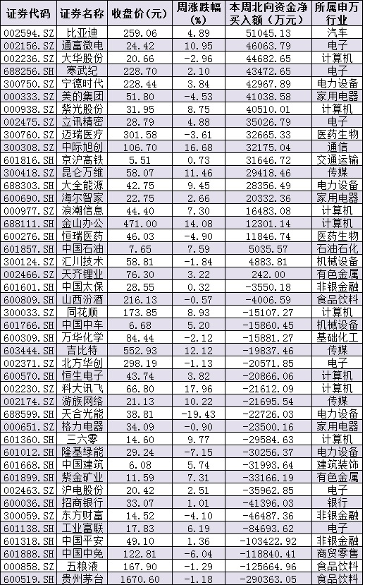 資金方面,周五,北上資金大幅凈買入85.34億元,創(chuàng)4個月來最大單日凈買入。本周北向資金累計(jì)凈買入金額達(dá)50.21億元。從前十大成交活躍股來看,本周,比亞迪、通富微電、大華股份、寒武紀(jì)、寧德時代、美的集團(tuán)、紫光股份等個股,北向資金凈買入金額均超4億元。另外,貴州茅臺、五糧液、中國中免、中國平安等個股遭北向資金凈賣出金額均超10億元。