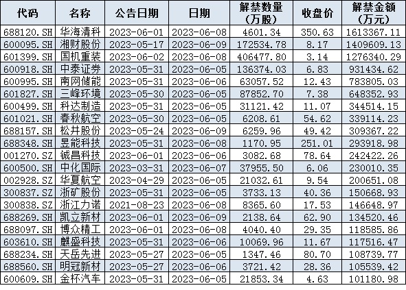 統(tǒng)計(jì)顯示,下周(6月5日至9日,下同)共有97家公司限售股陸續(xù)解禁,按最新收盤價計(jì)算,解禁市值為1058.04億元。從解禁市值來看,華海清科(161.34億元)、湘財(cái)股份(140.96億元)、國機(jī)重裝(127.63億元)等公司解禁金額均超100億元。