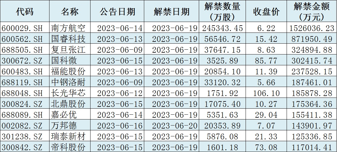 與此同時,據(jù)同花順統(tǒng)計(jì)顯示,下周(6月19日-23日)共有64家公司限售股陸續(xù)解禁,按最新收盤價計(jì)算,解禁市值為510.1億元。從解禁市值來看,南方航空(152.6億元)、國??萍迹?7.2億元)等公司解禁金額均超80億元。