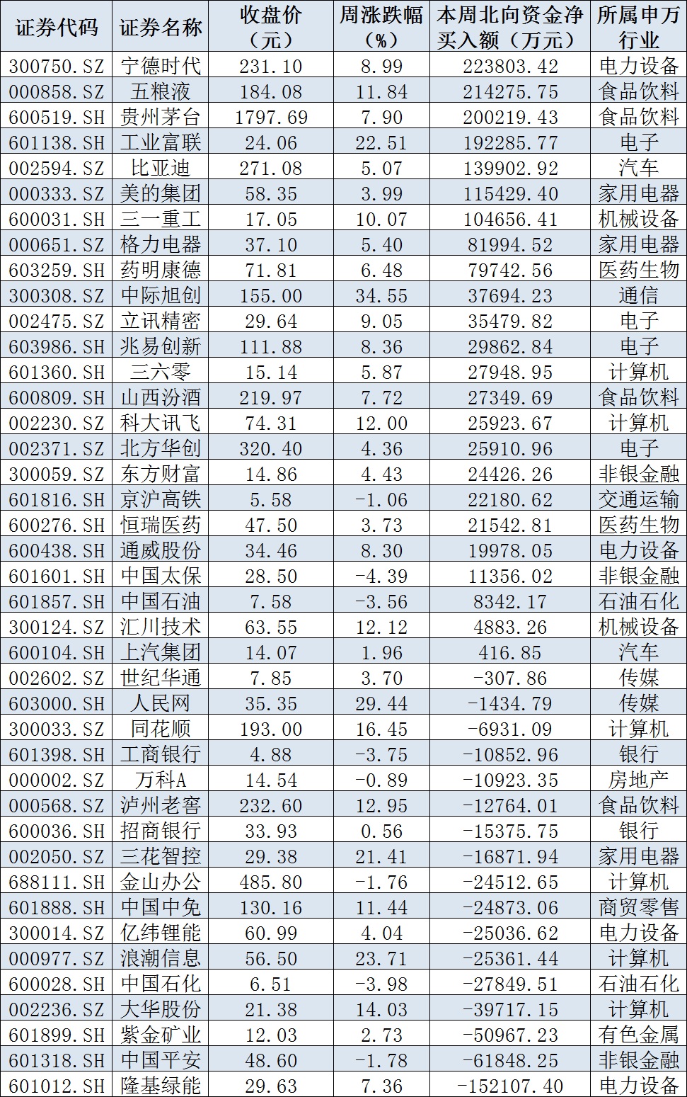 資金方面,本周,北向資金合計(jì)凈買入金額達(dá)143.91億元,創(chuàng)3個月來新高。6月16日,北向資金凈買入金額達(dá)105.46億元,為近4個月來最高。從前十大成交活躍股來看,寧德時代、五糧液、貴州茅臺等3只個股,北向資金凈買入金額均超20億元。另外,隆基綠能、中國平安、紫金礦業(yè)等個股遭北向資金凈賣出金額均超5億元。