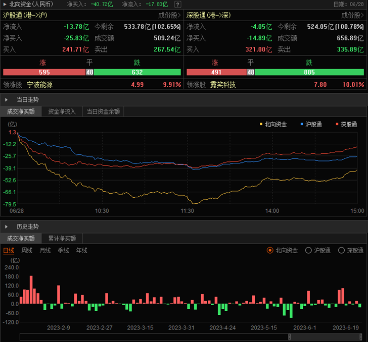 6月28日,滬指早盤出現(xiàn)快速下跌,最低至3157.12點,隨后企穩(wěn)回升,午盤后一度翻紅。最終,上證指數(shù)平盤報收3189.38點;深證成指跌0.47%報10926.32點,創(chuàng)業(yè)板指跌0.44%報2182.10點。A股合計成交額8897.09億元,較前一交易日增長5.63%;北向資金全天凈賣出40.72億元;其中滬股通凈流出25.83億元,深股通凈流出14.89億元。