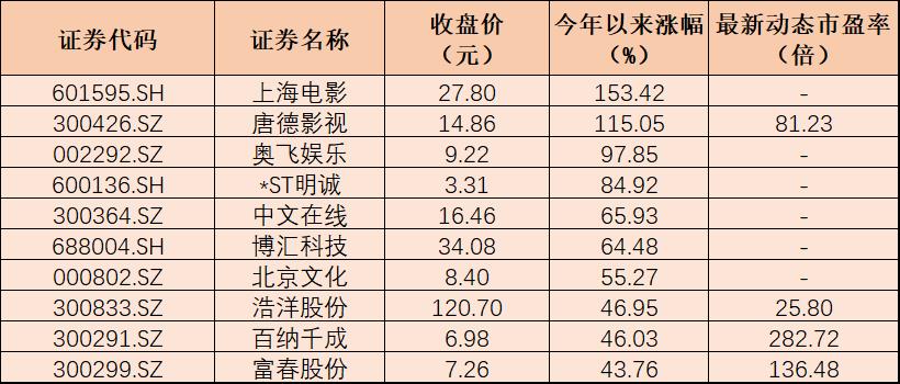 表:今年以來漲幅居前十的影視概念股一覽