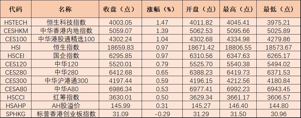 7月11日,港股市場(chǎng)指數(shù)普遍走強(qiáng),截至收盤,恒生指數(shù)漲0.97%,報(bào)18659.83點(diǎn);恒生科技指數(shù)漲1.47%,報(bào)4003.05點(diǎn),兩大指數(shù)均為連續(xù)第2個(gè)交易日實(shí)現(xiàn)上漲。