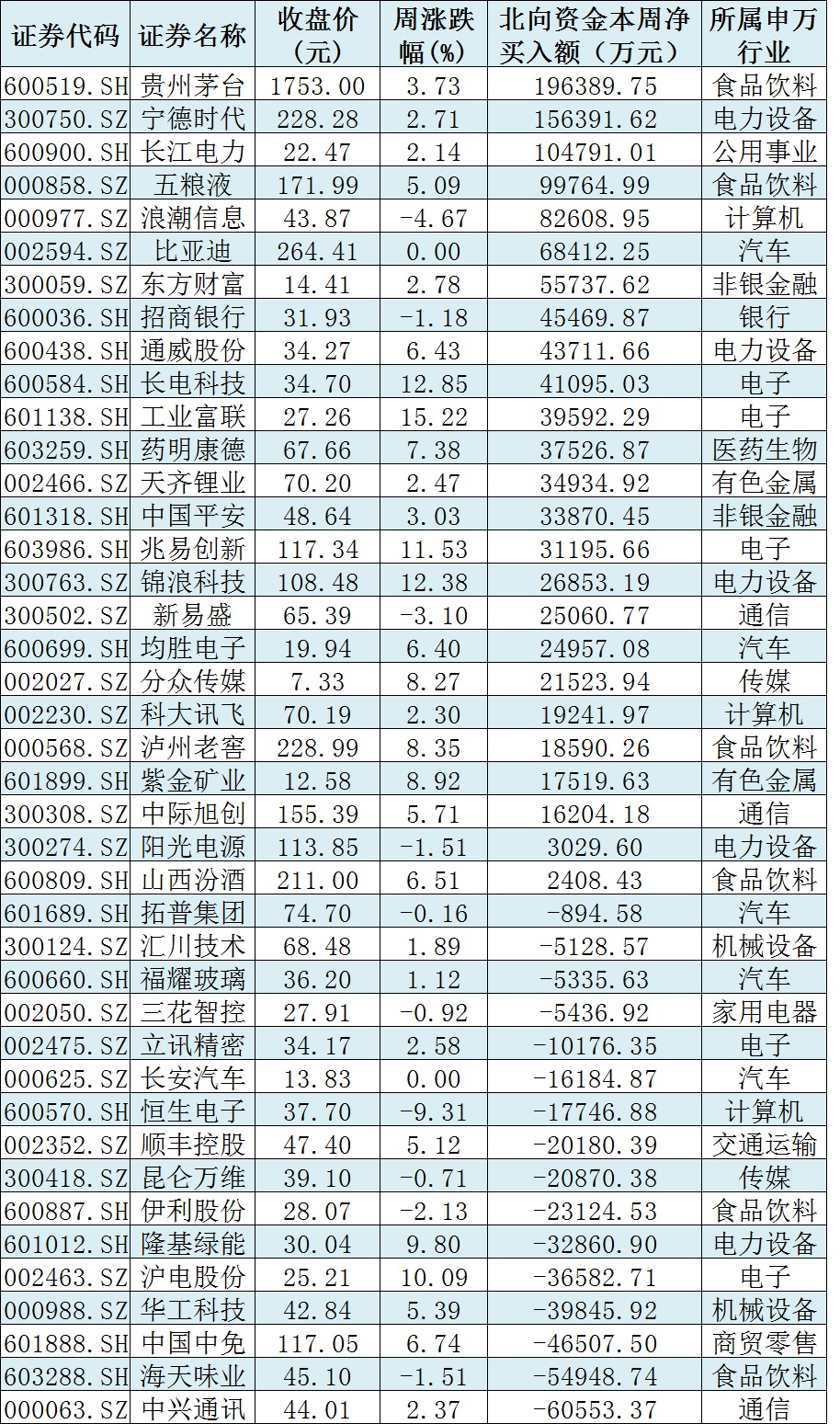 資金方面,本周北向資金累計凈買入金額達198.44億元,創(chuàng)5個月來最大單周凈買入,也是年內(nèi)第5大周凈買入。從前十大成交活躍股來看,本周,貴州茅臺、寧德時代、長江電力等3只個股,北向資金凈買入金額均超10億元。另外,中興通訊、海天味業(yè)等個股遭北向資金凈賣出金額均超5億元。