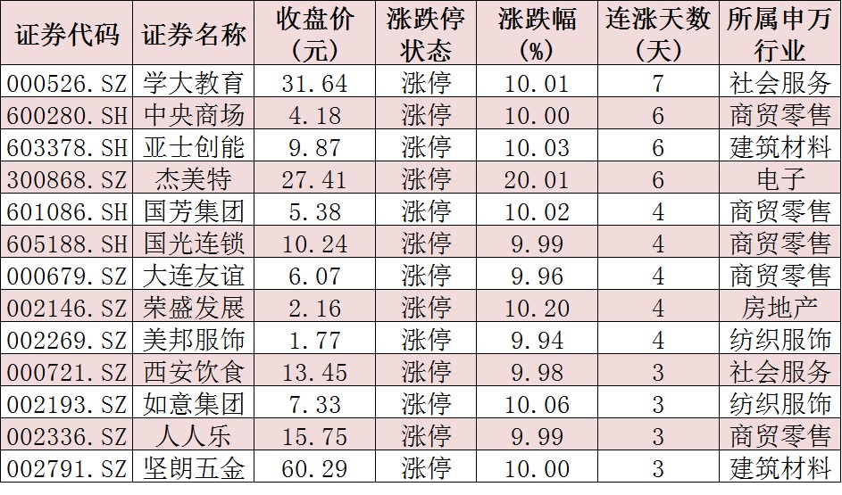 表:連續(xù)上漲3日以上且今日收盤漲停個股情況:
