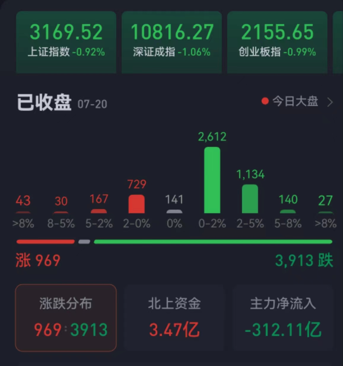 周四(7月20日),A股三大股指震蕩下行,全線飄綠。截至收盤,上證指數(shù)跌0.92%報(bào)3169.52點(diǎn),深成指跌1.06%報(bào)10816.27點(diǎn),創(chuàng)業(yè)板指跌0.99%報(bào)2155.65點(diǎn),科創(chuàng)50指數(shù)跌1.43%;兩市合計(jì)成交金額達(dá)7856.2億元;北向資金凈買入額達(dá)3.47億元。總體上看,兩市個股跌多漲少。近4000只個股下跌,其中,漲停個股達(dá)30只,跌停個股達(dá)4只。